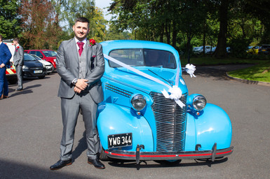 Arriving in style, the groom entered the venue in a blue vintage car adorned in white ribbons. Chris and the groomsmen all wore grey suits, waistcoats and maroon ties.